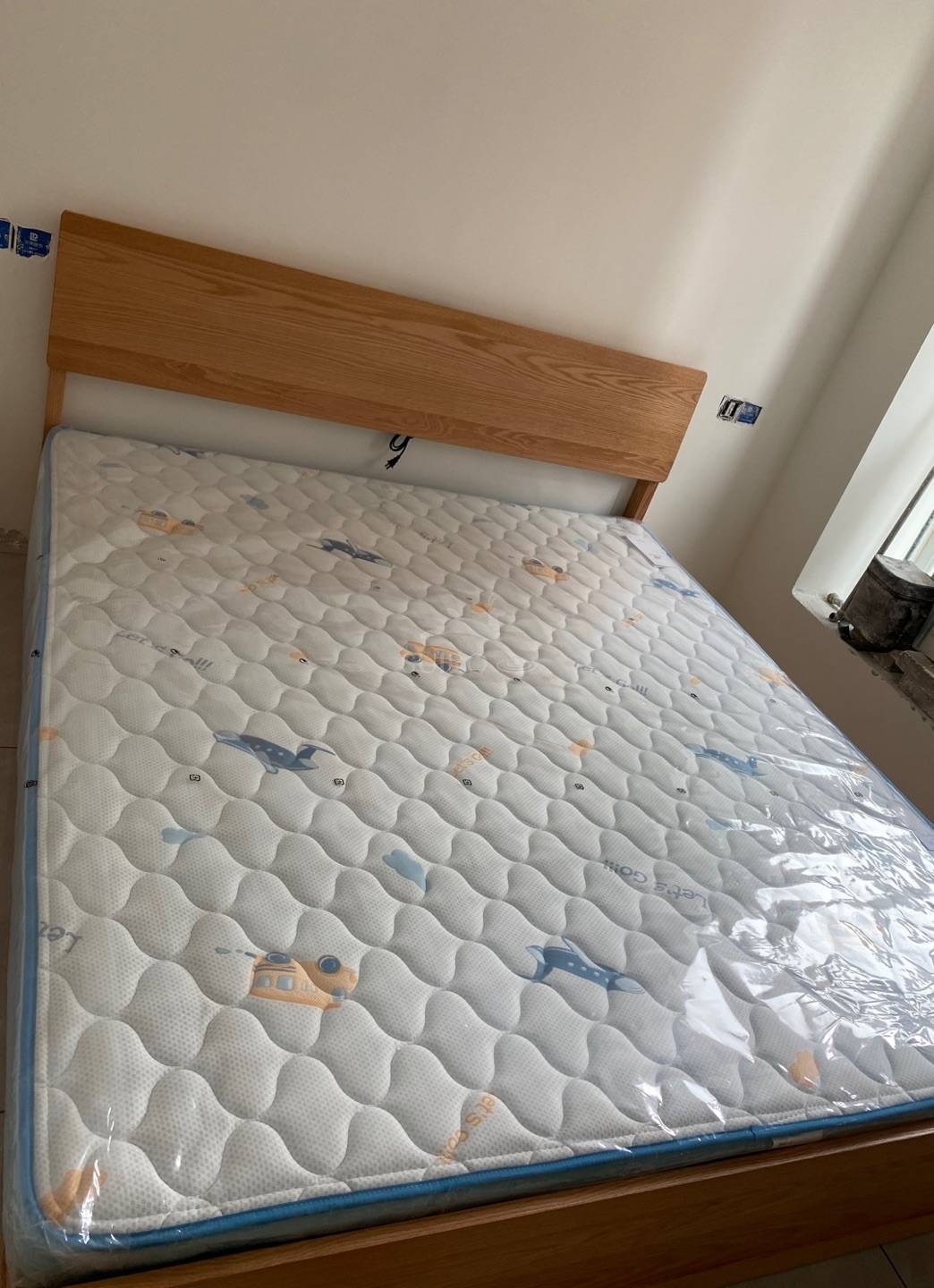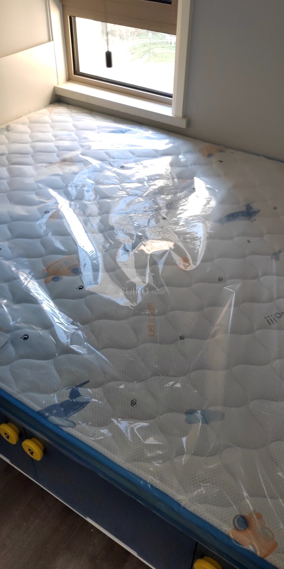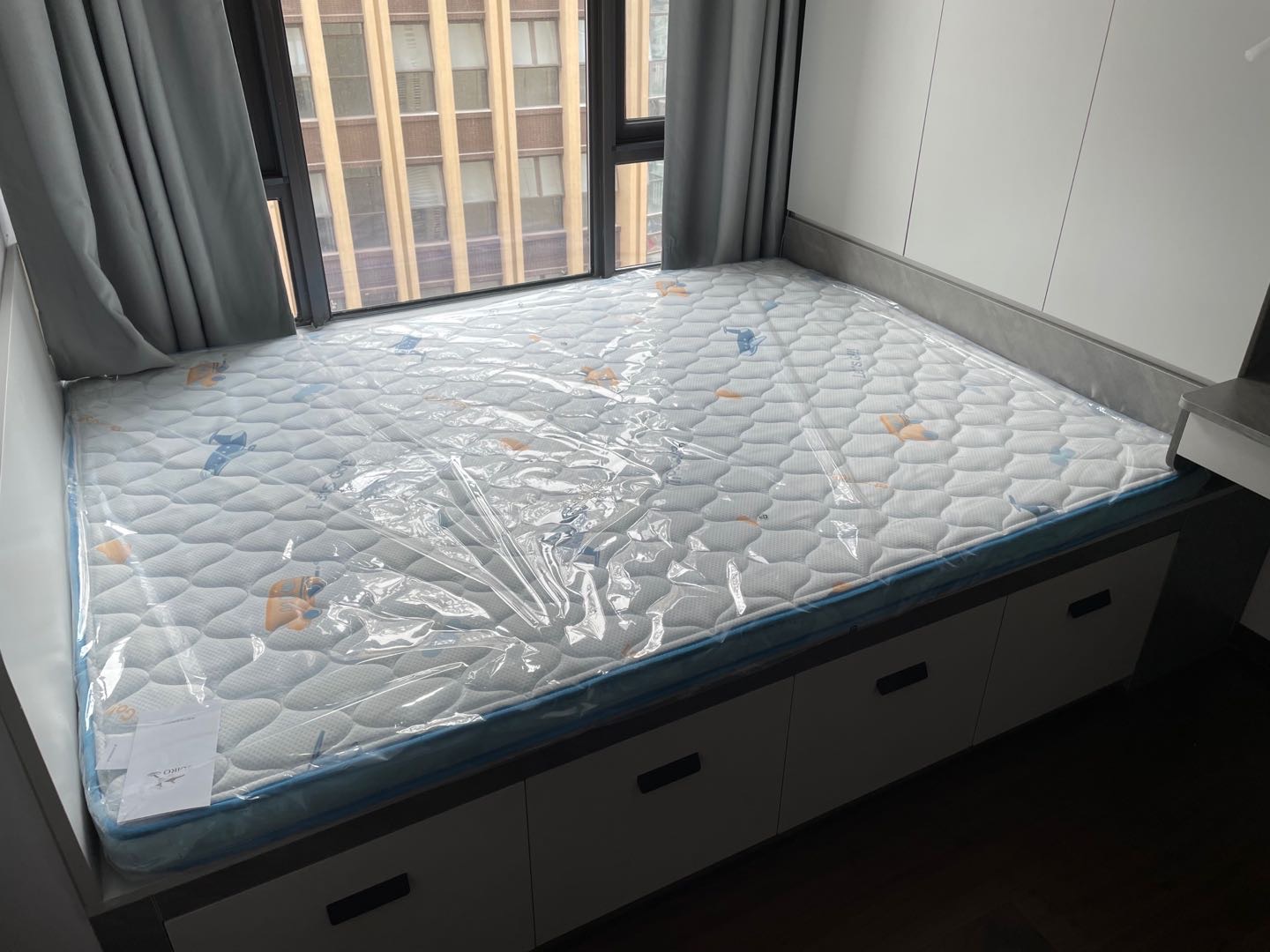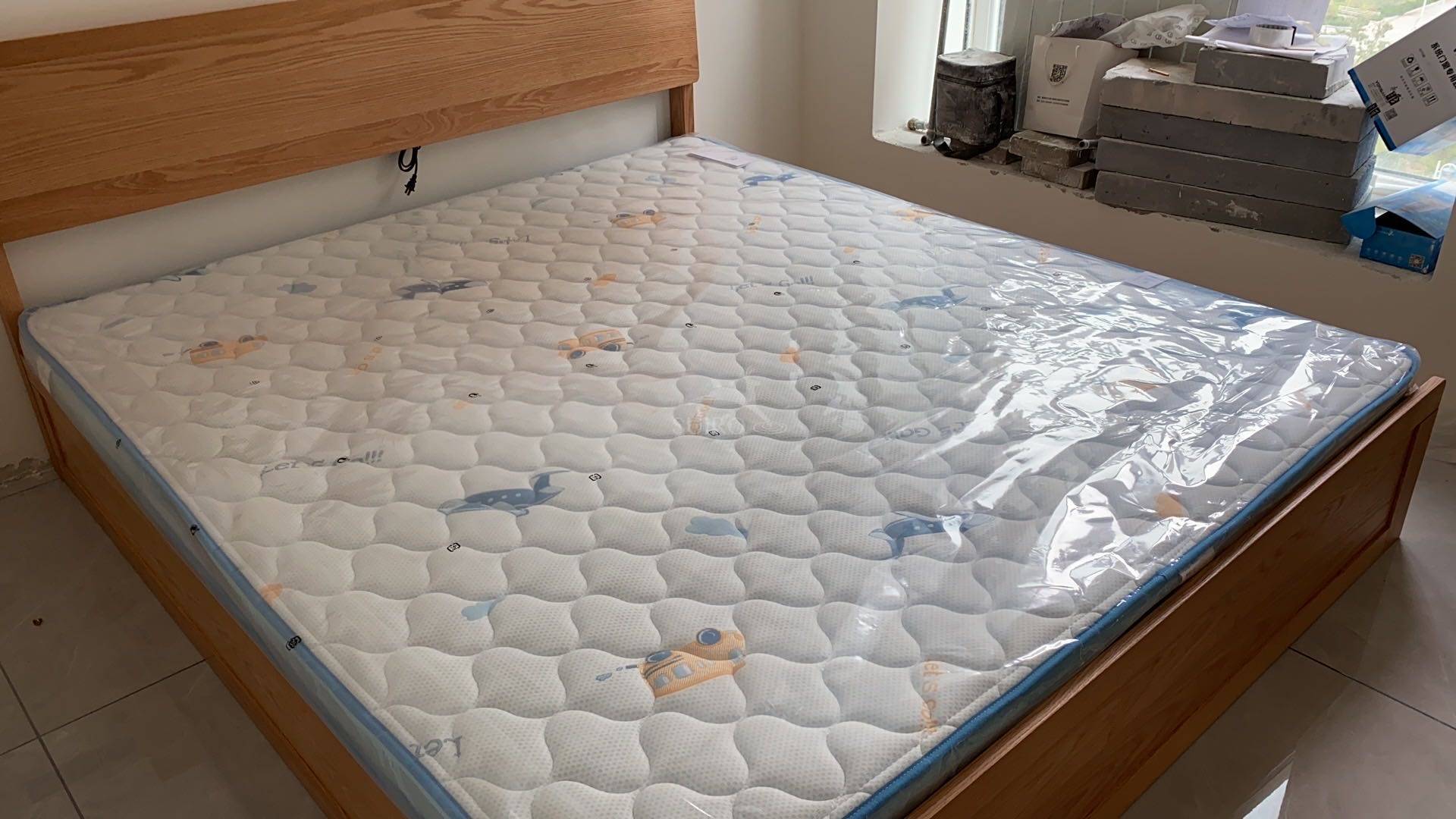 图案很可爱,床垫无异味,相信水鹿的品控. 包装的挺好的,外面牛皮编织袋简单大方,防磨损,四个角纸板包好的,内里有层厚厚的塑料膜,防渗,一开始以为外包装湿了里面也可能湿,结果里面完好,过几天放上去,用段时间再评价