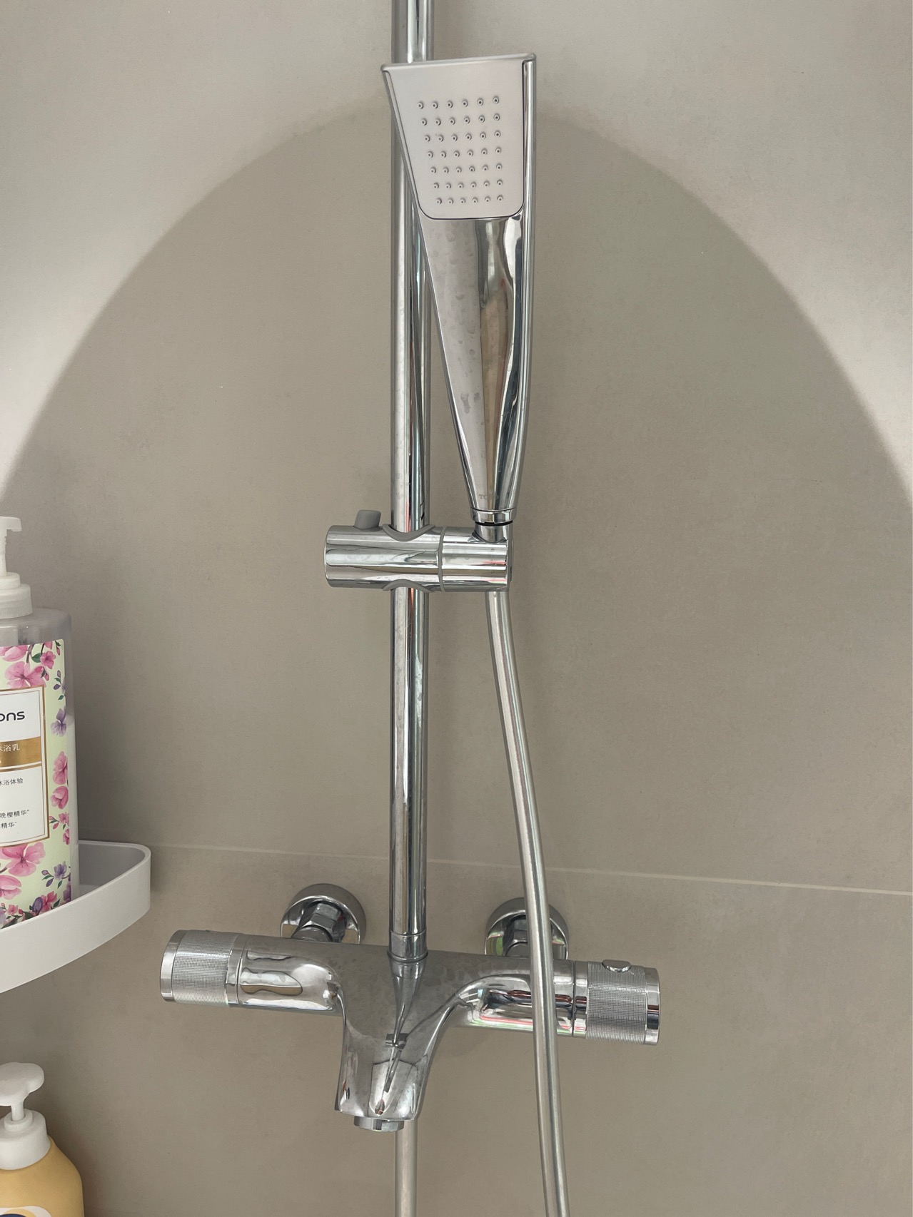 追加评论:造型漂亮,做工精细。使用几个月下来,感受很好,一点不输kvk。温控稳定,老婆和孩子喜欢用手持,扇子手持出水非常舒服,出水面积足够大,握感舒适。我喜欢用顶喷,也很舒服。已经推荐给朋友。不锈钢镜面也很好打理,安装方便,我甚至是自己安装完成的。